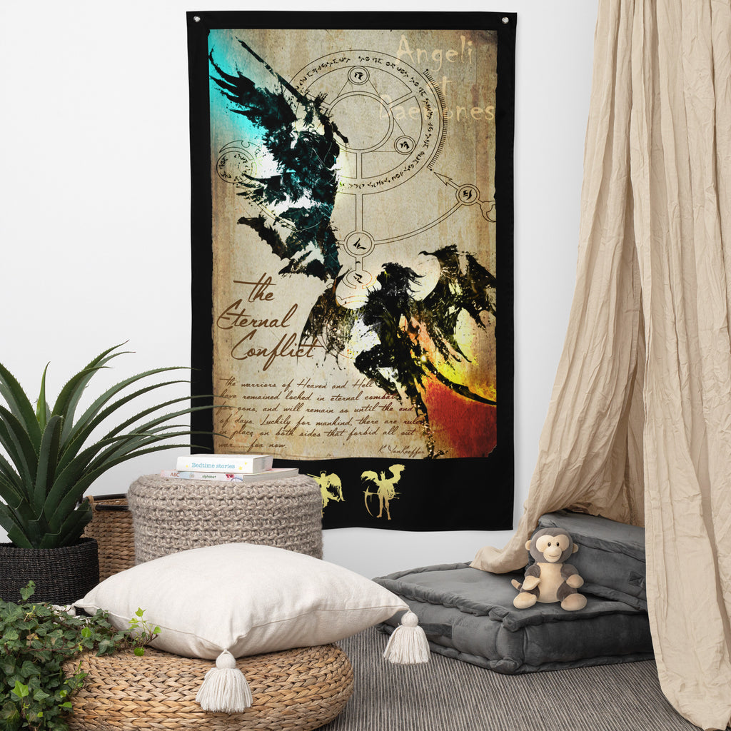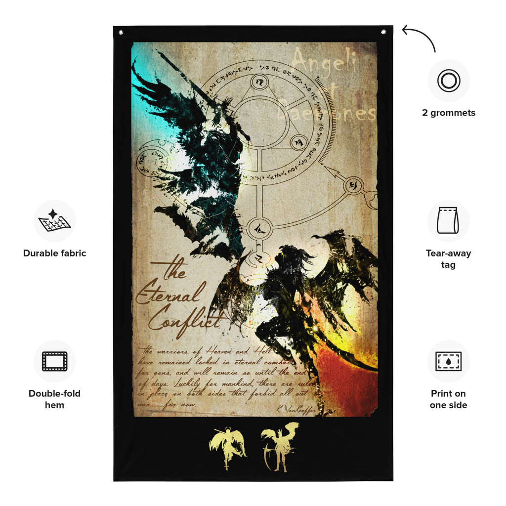 The Eternal Conflict, from my myths and monsters series. Who doesn’t want to turn their house into a monster hunter's lair?? Darken up your space by adding this unique flag to your wall. Your flag won’t crease or shrink thanks to the polyester material and will last a long time.