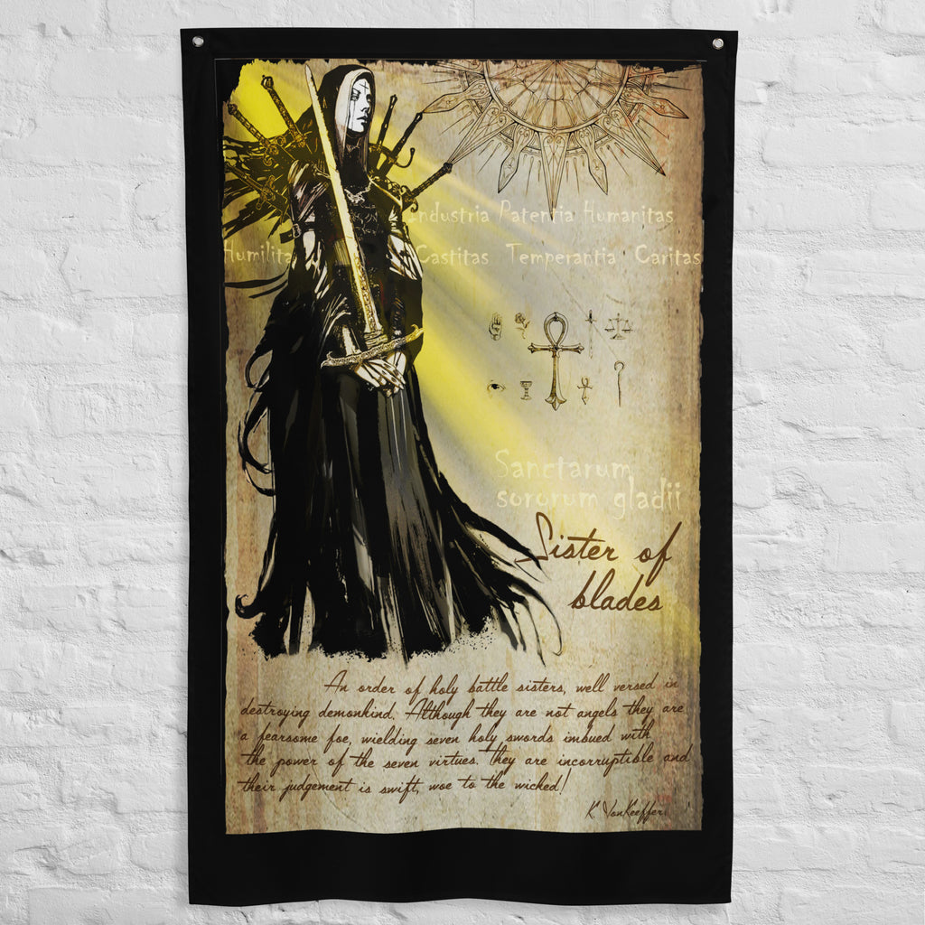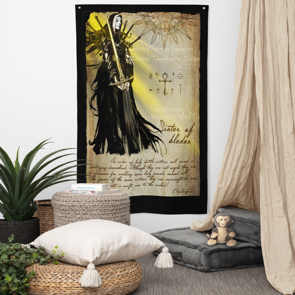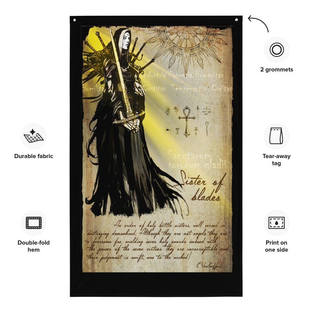 The Sister of Bladesl, from my myths and monsters series. Who doesn’t want to turn their house into a monster hunter's lair?? Darken up your space by adding this unique flag to your wall. Your flag won’t crease or shrink thanks to the polyester material and will last a long time.